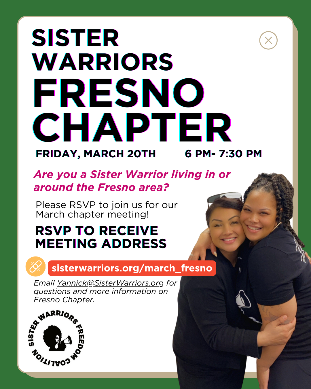 Are you a Sister Warrior in the Fresno area? Please join us this month for our March Sister Warriors Freedom Coalition chapter meeting.