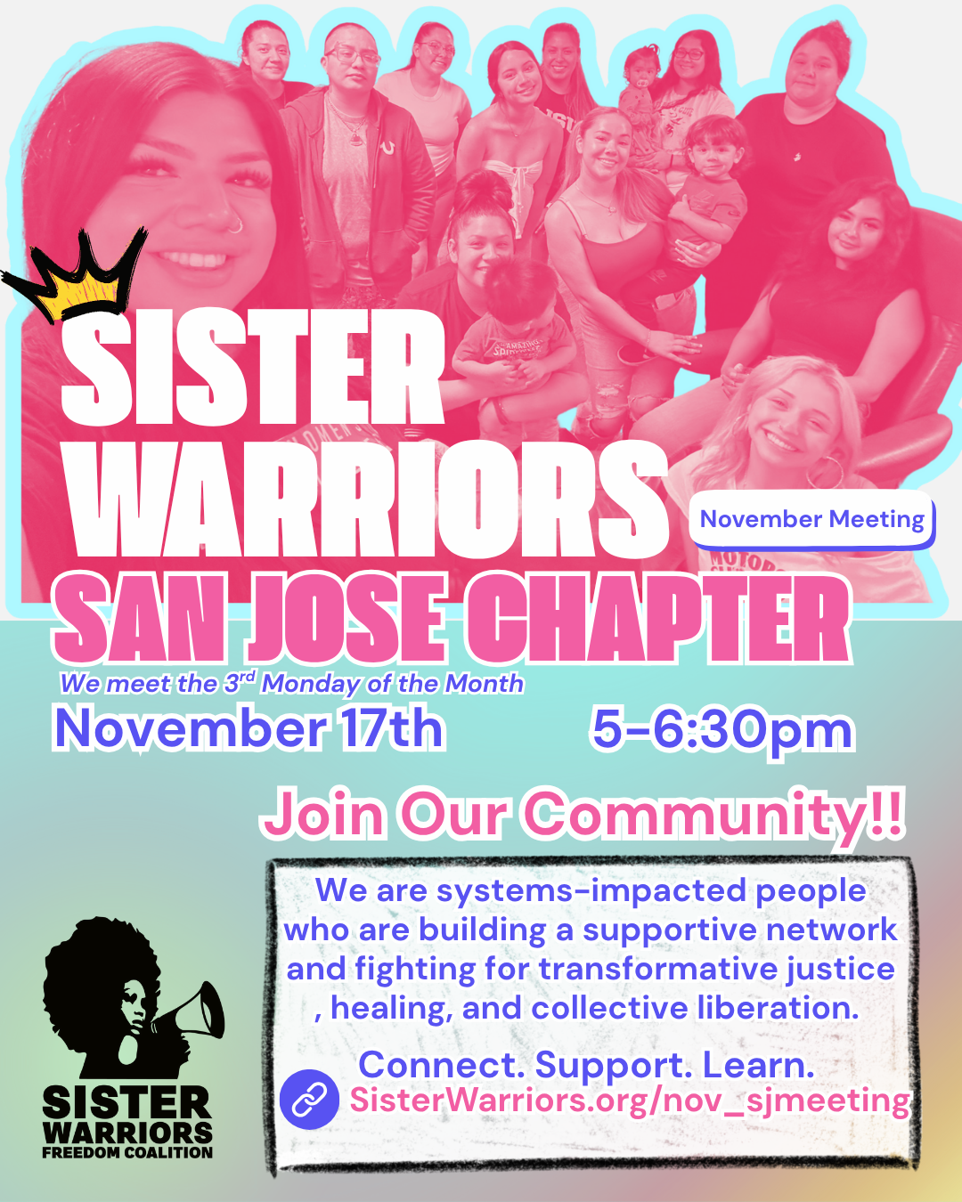 San Jose Sister Warriors! Our November meeting is coming up soon- please join us as we gather in community and power.